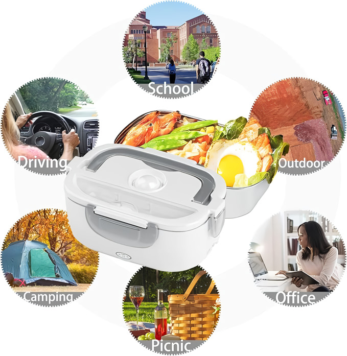 Os 2 compartimentos removíveis de PP mantêm o seu prato principal e acompanhamento separados – e ambos vão direto para a máquina de lavar louça depois. Funciona no escritório, no carro, num estaleiro de obras ou em qualquer divisão com uma tomada elétrica.