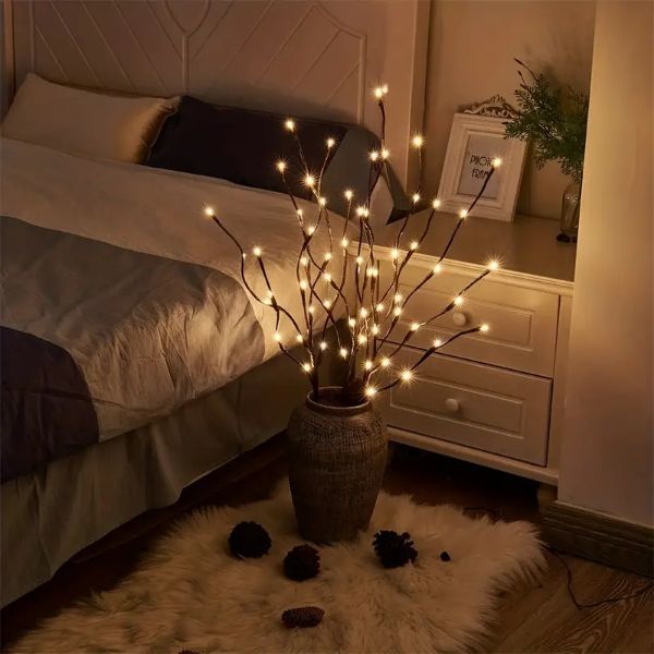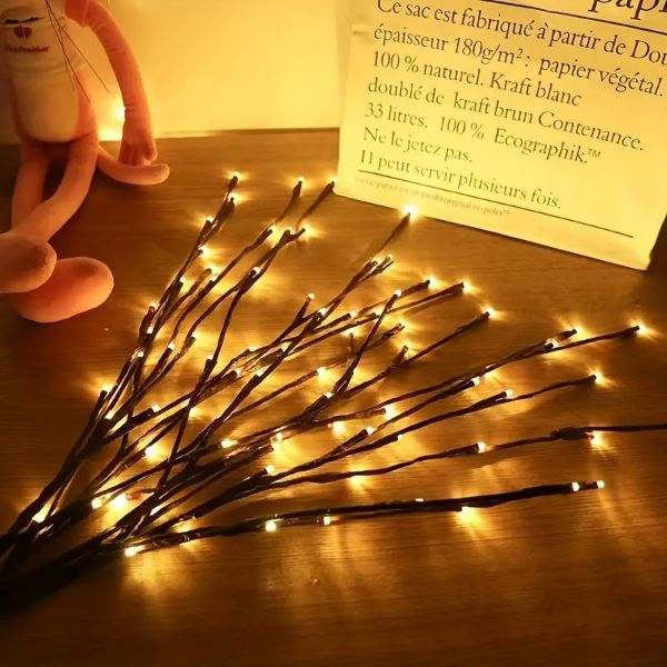 Um conjunto de luzes de ramos LED composto por três ramos, cada um com 20 LEDs, totalizando 60 pequenos suportes de lâmpadas, proporcionando iluminação suficiente para criar um ambiente acolhedor e convidativo.