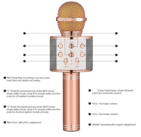 - Fácil de utilizar — Este microfone Bluetooth é muito fácil de utilizar. Existem apenas alguns botões fáceis de utilizar, como os botões deslizantes para controlar o volume do microfone e a intensidade da mistura e os botões +/- para regular o volume da coluna e mudar de música. Depois de o ligar ao seu dispositivo (ou cartão microSD), está na hora da festa!